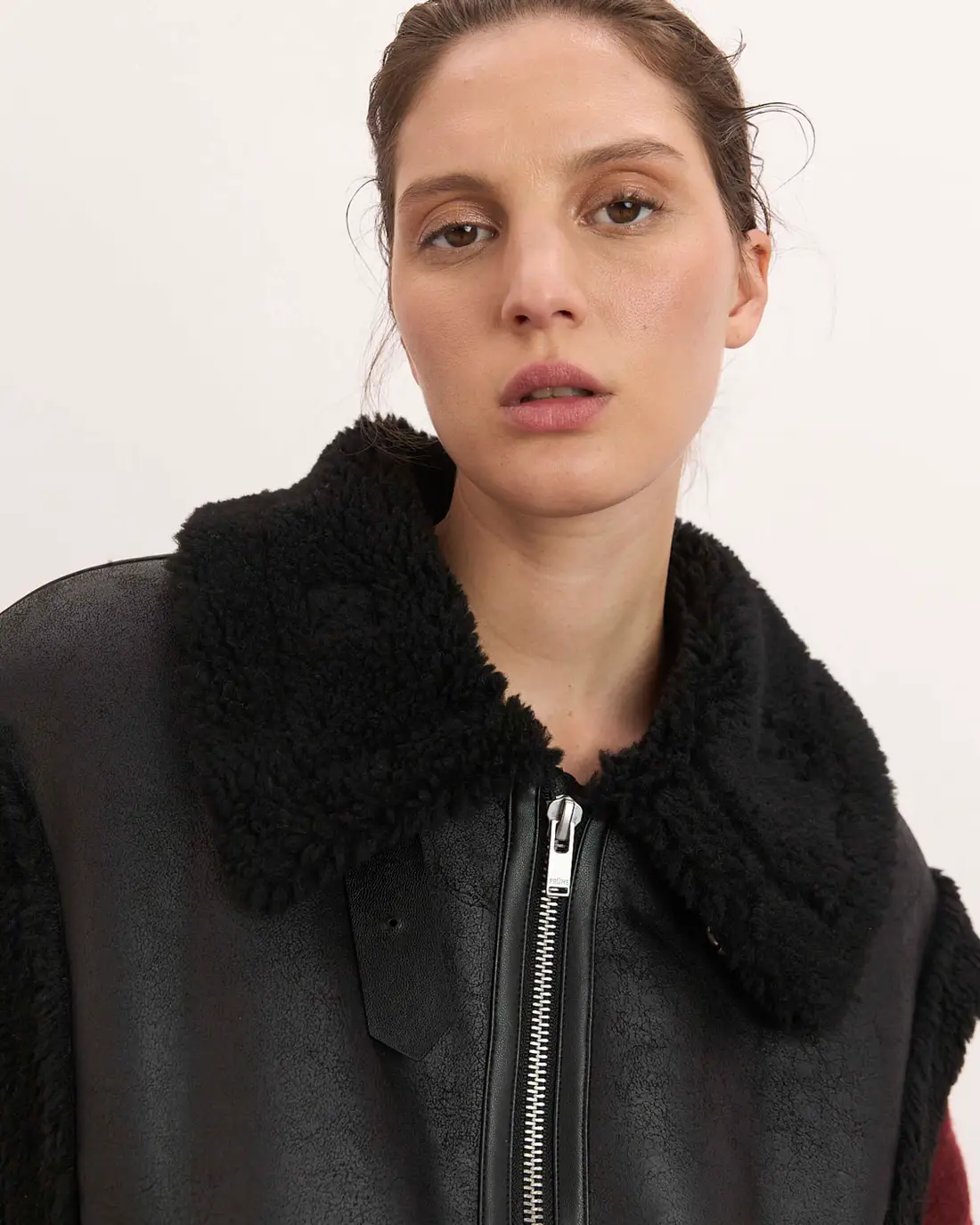 El chaleco Shiga es una prenda tendencia de la temporada. tiene un acabado símil cuero en el exterior y símil oveja al interior. con detalles de hebilla en el cuello y en los laterales y cierre frontal.